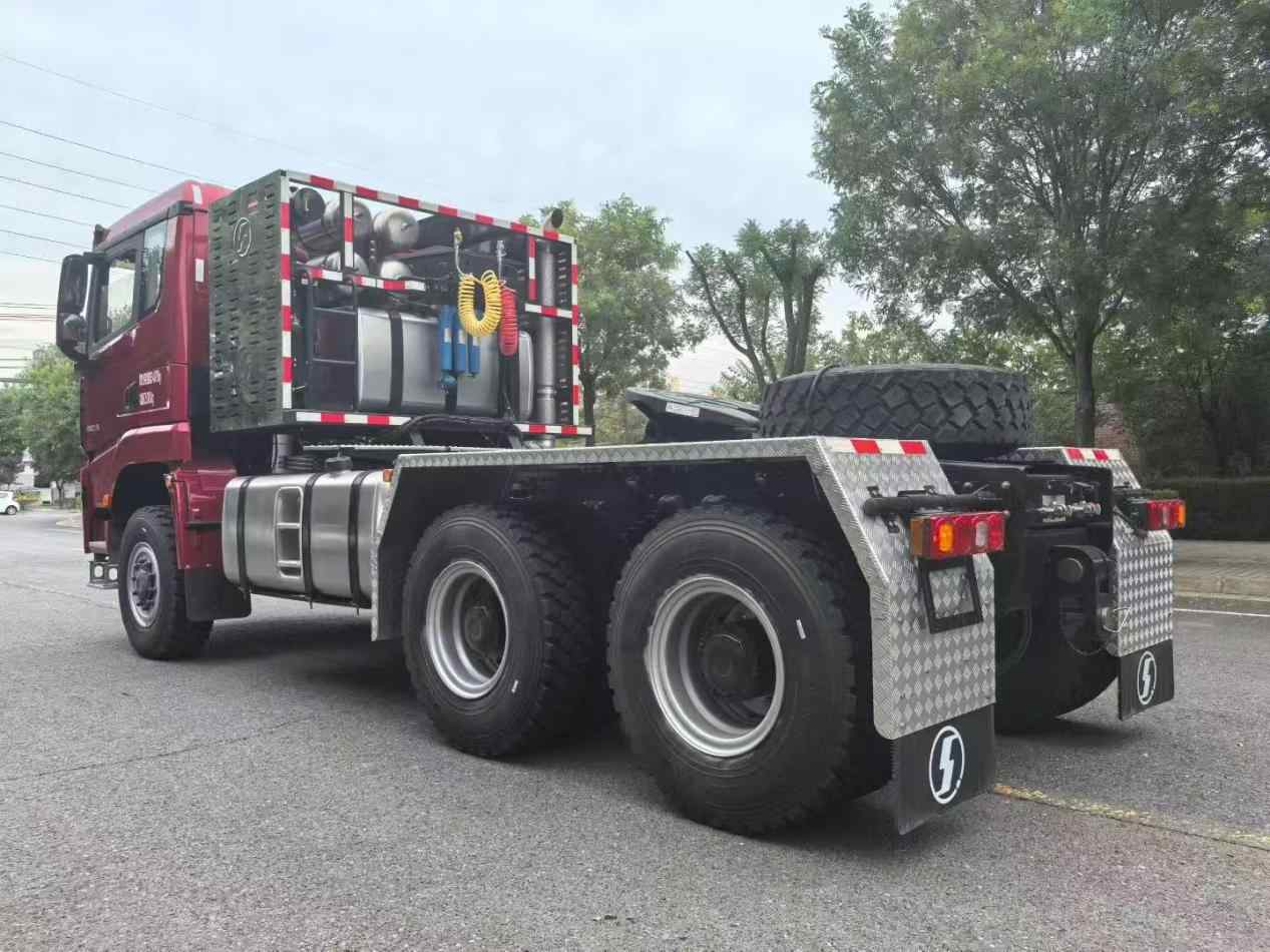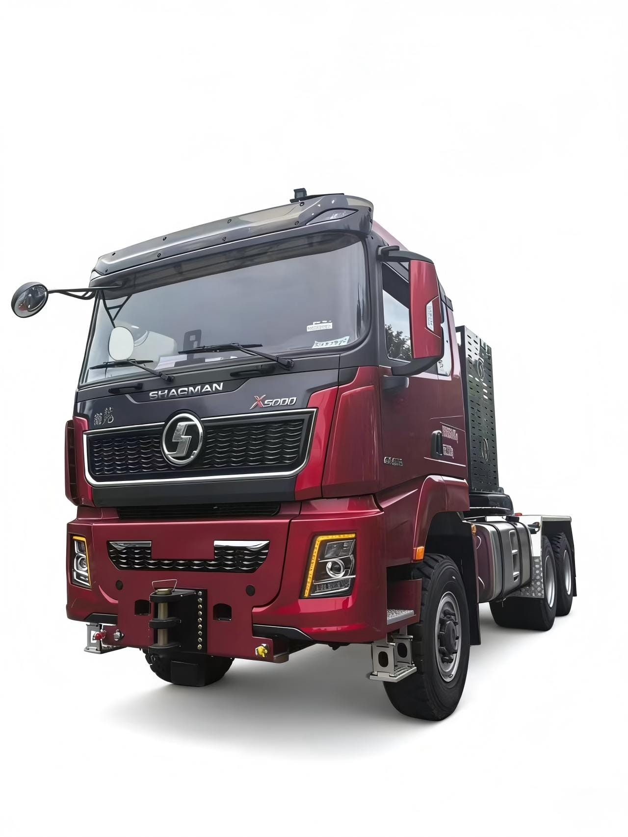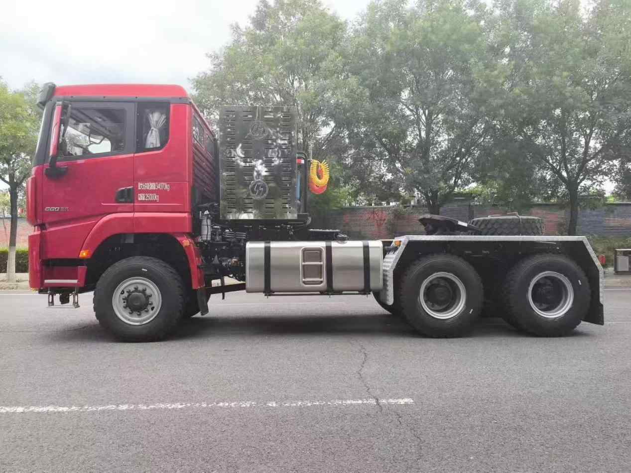 SHACMAN  X5000L Extended high roof cab with side deflector without top deflector / Color: Enamel Red / Drive Type 6 × 6 / Cummins M15NS660 / Allison 4970 SP-PR Gearbox with hydrodynamic torque converter/ ZQC2800 brake (with brake cooling) / 9 tons MAN front steering drive bridge speed ratio – 5.92 / 16 ton class MAN midway bridge – 5.92/ front bridge tyres 365 / 85R20 vacuum tyres, trim TRY66 / midway bridge tyres 12.00R2016PR / Domestically reinforced 90 double saddle seats / special rack for large tractor vehicles (970-850) × 300 (8 + 7) / wheelbase 3900 + 1450 / Electric flip / versatile steering wheel (with set speed cruise) / daytime driving lights / domestically powered steering wheel/ Auxiliary cooling system / Aluminum alloy fuel tank: 760L + 700L + 400L / 3-way camera / Tianjian Zhixing with display screen / 220Ah low temperature maintenance-free storage battery / Special bumper for large tractor / Special front and rear traction device for large tractor / Integral closed metal fender for middle rear axle / Automatic control Active thermostat air conditioner / electric window shaker / central lock (dual remote control, Two mechanical keys) / Electric heated mirror / Emergency warning lamp and 4 front working lights shipped on the truck, Factory not installed / LDWS + FCW + ESC + ABS / Chassis version: Super Version / Issued SX4259XE5 certificate